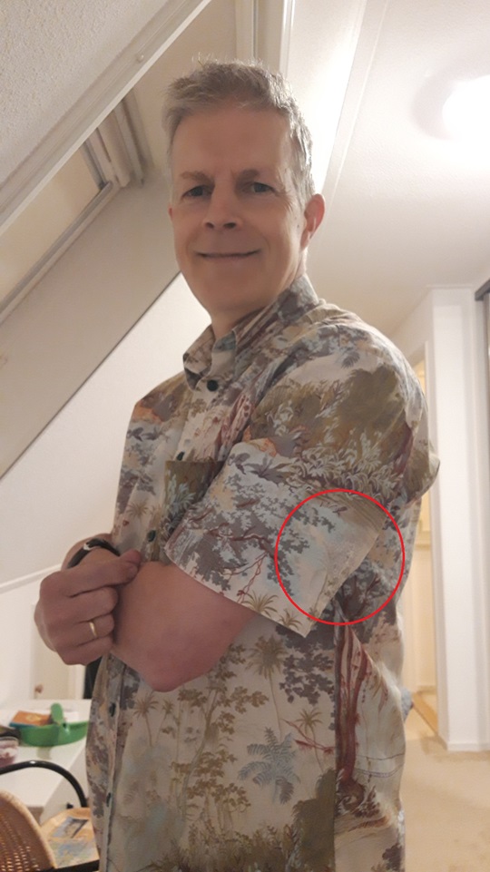 Toen ik ongeveer 25 jaar oud was, kocht ik dit overhemd. Het is dus nog vrij nieuw. Op een dag droeg ik dit overhemd en toen liep ik langs een deur. De deurkruk kwam in mijn mouw, maar ik zag het niet. Ik liep verder en toen ging die deurkruk dwars door mijn overhemd. Dus toen zat er een groot gat in mijn overhemd. Dat was heel jammer, want ik had dit overhemd toen nog maar een paar weken. Mijn moeder zei: "Wacht maar, ik zal het proberen te maken." Ze heeft ontzettend haar best gedaan om met draden in de juiste kleur dat gat dicht te maken. Ik vind het heel knap gedaan.